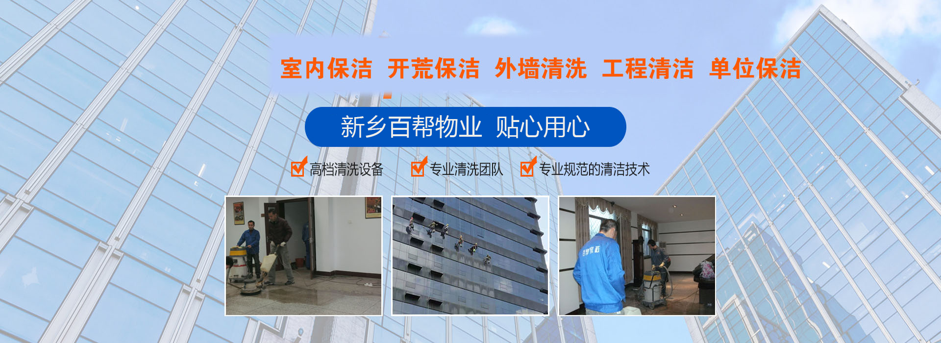 熱烈慶我新鄉百家保潔公司網站建設成功投入運行,公司主要承接新鄉家政保潔、高空外墻粉刷清洗、公司廠房清潔、4S店擦玻璃、家電清洗、甲醛檢測、高溫殺菌消…